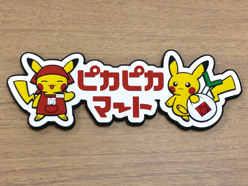 ピカピカマートのロゴとピカチュウたちがデザインされた、かわいいラバーマグネットだよ。